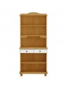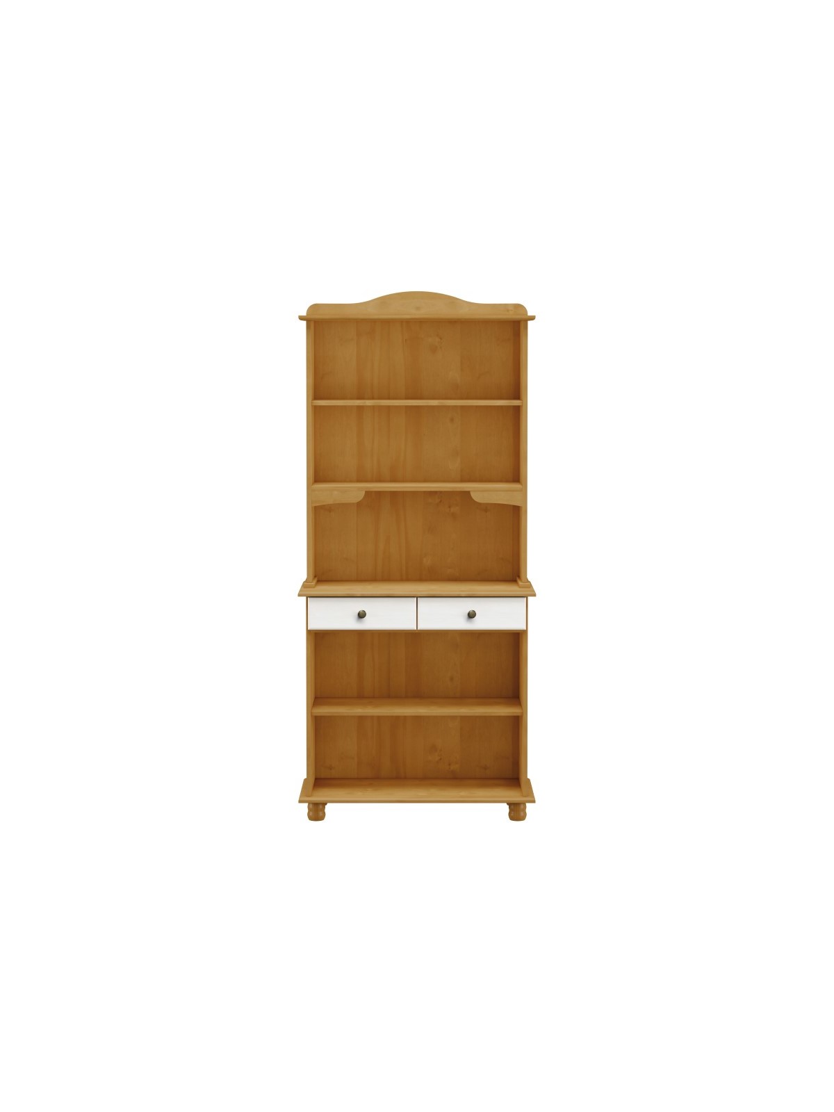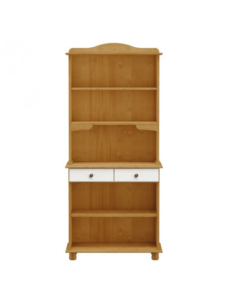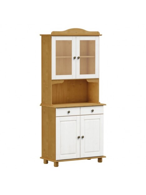 Resumen | Aparador Cristalero 100% en madera maciza de pino brasil, combinado en Blanco y Natural, 2 puertas superiores con vidrios + 2 cajones con guías telescópicas y 2 puertas inferiores con estantes, tiradores metálicos. |