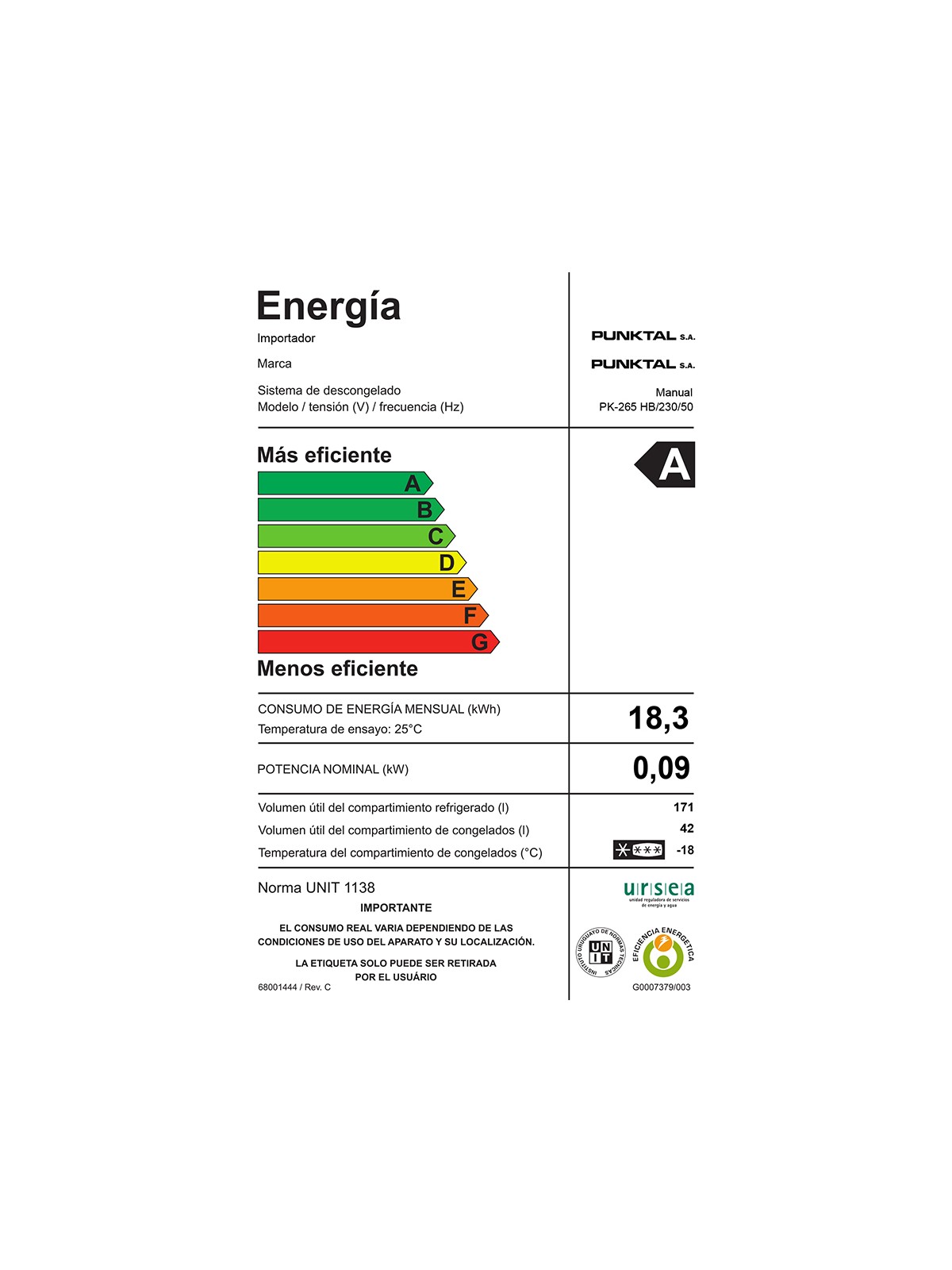 Capacidad neta del refrigerador 171 Lts