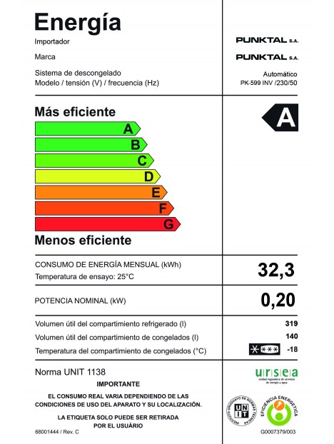 - Volumen neto 459 Lts