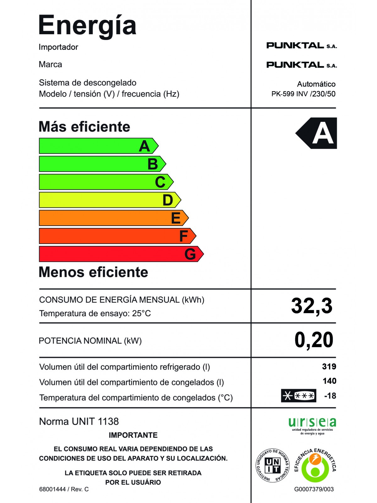 - Capacidad neta del congelador 140 Lts