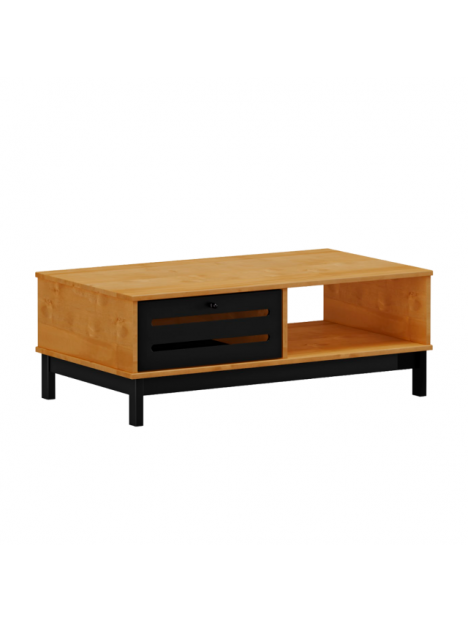 Mesa de Centro colección "Madrid" para living. Estructura en madera maciza de pino color natural, con detalles en puerta y tiradores metálicos de PVC en negro. Acabados naturales de fácil armado y entrega inmediata, se entrega desarmado de origen para preservar el cuidado y estado de la mercadería. Diseño moderno y versátil.